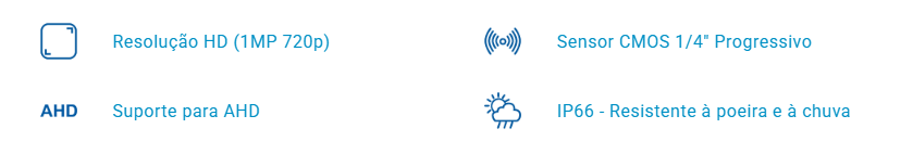 Sensor de imagem: 1/4” CMOS Progressivo Pixels efetivos: 1280 (H) ×720 (V) Linhas horizontais: 1280 (H) Resolução: HD: 1MP – 720p Lente: 2,8 mm Ângulo de visão horizontal: 70° Ângulo de visão vertical: 38° Alcance infravermelho (IR): 15 m Formato de vídeo: PAL/NTSC Protocolos de vídeo: AHD Relação sinal/ruído: >48 dB Sensibilidade: 0.1 Lux (F1.2, AGC ON) Obturador: Eletrônico Dia e Noite: Automático / Preto e Branco |