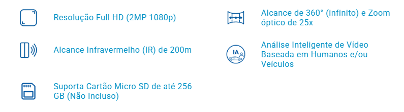 Alcance do Pan/Tilt: Pan: 0° ~ 360° (infinito) Tilt: -10° ~ 90° Velocidade manual: Pan: 0,1º ~ 180º/s Tilt: 0,1º ~ 90°/s Velocidade máxima dos presets: Pan: 180º/s Tilt: 90°/s Quantidade de presets: Até 400 Funcções PTZ: 6 Patrulhas, 12 tour (até 32 presets), 12 autoscan Zoom: 25x Óptico e 16x Digital Auto Tracking: Suporte Memória de status: Suporte |