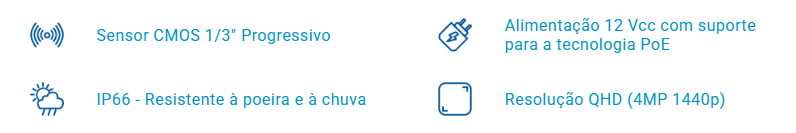 Sensor de imagem: 1/3” Progressivo CMOS Pixels efetivos: 2560 (H) × 1440 (V) Linhas horizontais: 2560 (H) Resolução: QHD 4MP – 1440p Alcance infravermelho: 30 m Quantidade de LEDs IR: 2 Relação sinal/ruído: > 55 dB Sensibilidade: 0,01 Lux (F1.6, AGC ON) Obturador eletrônico: Automático / Manual (1/5 ~ 1/20000 s) Modo dia e noite (ICR): Automático / Preto e Branco |