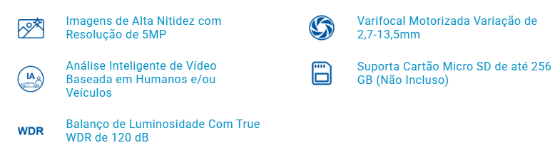 A Câmera WCAM IP-M05V-B51 foi desenvolvida para aplicações profissionais que exigem alta resolução, análise inteligente de vídeo e robustez. Com resolução de 5MP e lente varifocal motorizada de 2,7 ~ 13,5 mm, ela garante imagens nítidas em diferentes condições de iluminação, sendo ideal para uso interno e externo.