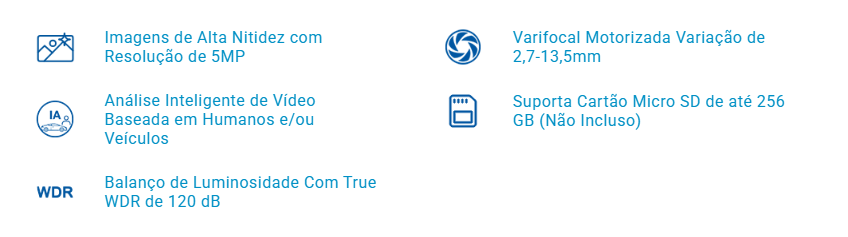 Lente Varifocal motorizada: Variação de 2,7~13,5 mm Abertura máxima: F1,6 Ângulo de visão horizontal: 33,1° ~ 102,3° Ângulo de visão vertical: 18,5° ~ 54,3° Tipo de Irís: Fixa |