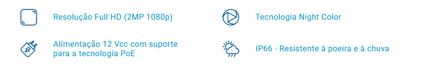 Sensor de imagem: 1/2.8” CMOS Linhas horizontais: 1920 (H) Resolução: HD: 2MP - 1080p Quantidade de LEDs: 2 Relação sinal/ruído: >55 dB Sensibilidade: 0.01 Lux (F1.6, AGC ON) Obturador eletrônico: Automático / Manual (1/5 ~1/20000 s) Dia e Noite (ICR): Automático/Preto e Branco/Colorido |